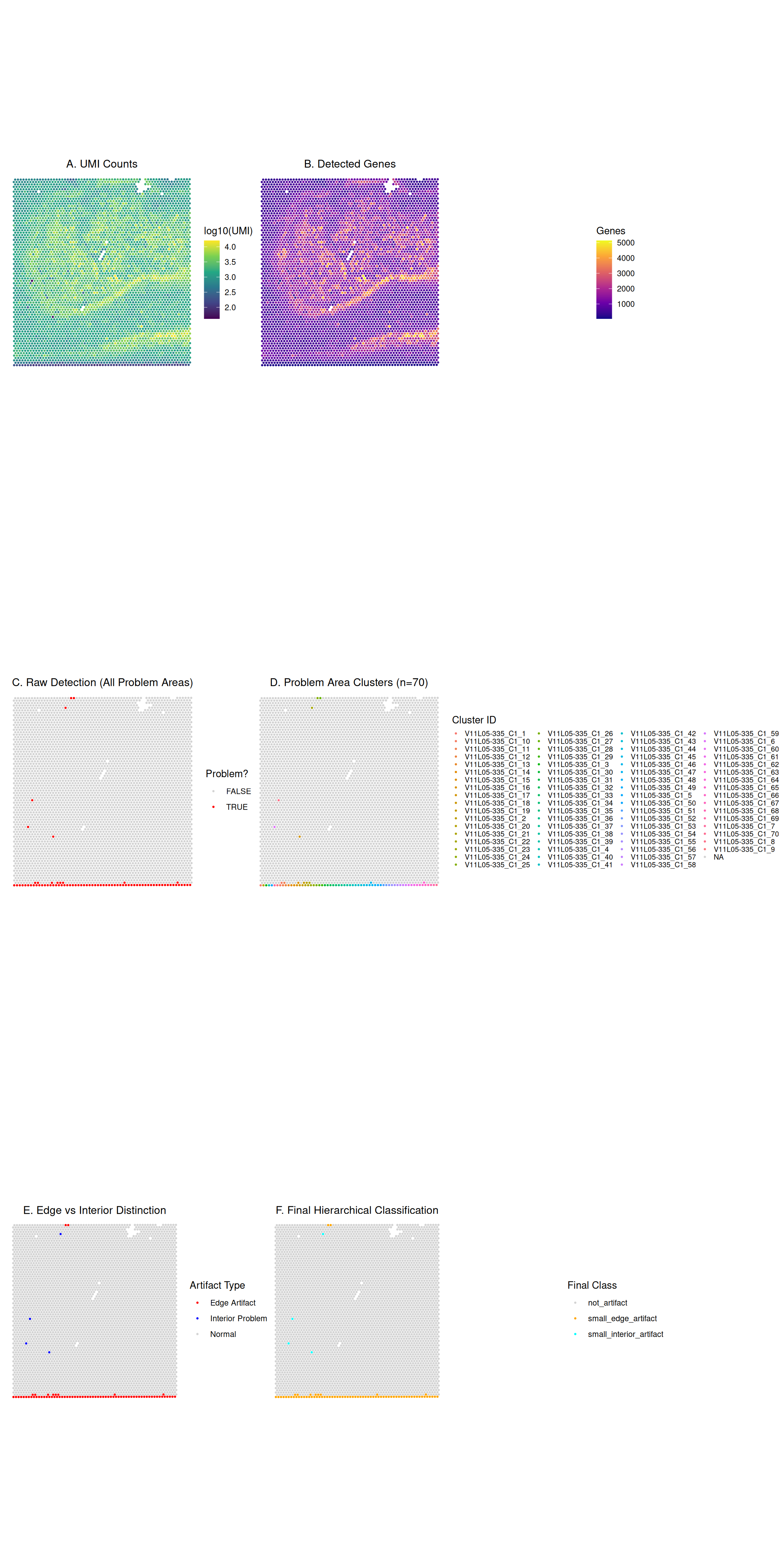 spe object processed by detectEdgeArtifacts()_edge_artifact (TRUE or FALSE) based on the detection step?_problem_size larger than min_spots (default: 20)?"not_artifact" — High-quality spots"large_edge_artifact" — Large artifact cluster (> min_spots) touching the tissue edge"small_edge_artifact" — Small artifact cluster (≤ min_spots) touching the tissue edge"large_interior_artifact" — Large artifact cluster (> min_spots) located inside the tissue"small_interior_artifact" — Small artifact cluster (≤ min_spots) located inside the tissueThe output from this phase will add one classification column named _classification.